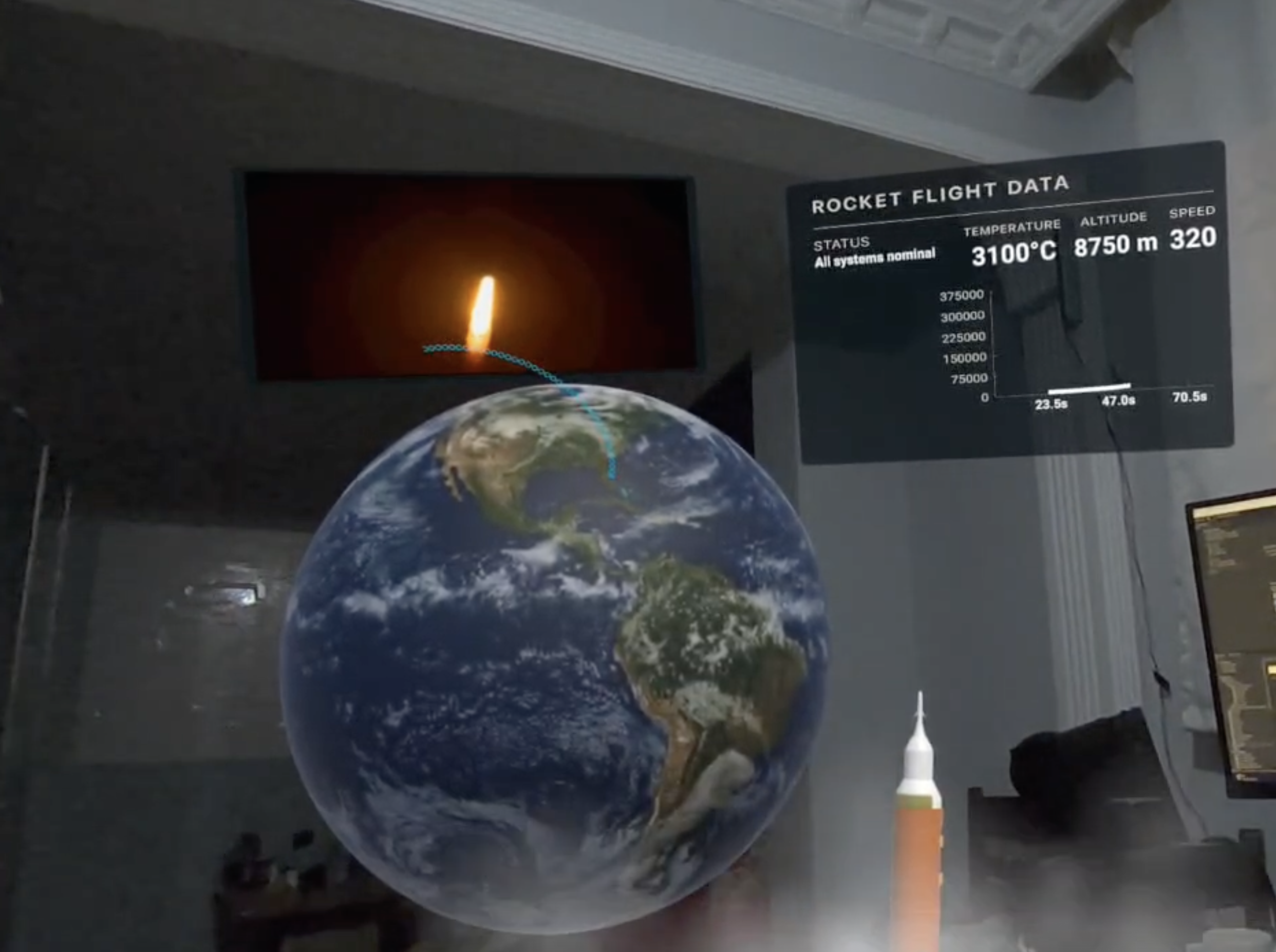Real-time synchronized 3D VR simulation of NASA rocket launches.